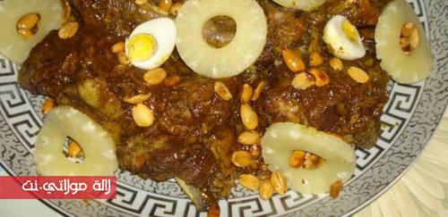 * في صحن التقديم، توضع قطع اللحم ويوضع فوقها البرقوق ثم يسقى الكل بالمرق، ويرش فوق حبات البرقوق القليل من الزنجلان المحمص، وتوضع دوائر الأناناس في حاشية الصحن، وأكلة شهية