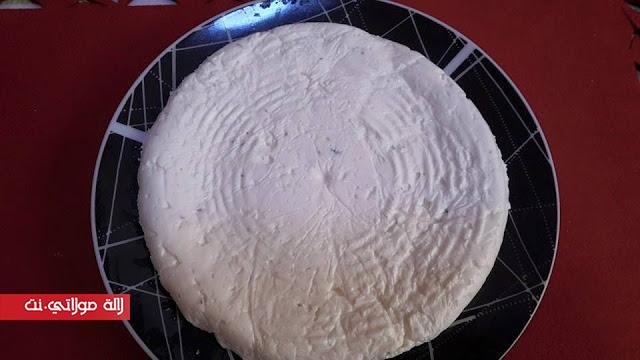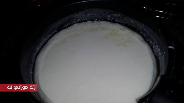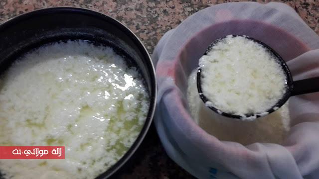 ثم نضيف ملعقتين من الخل إلى الحليب واللبن ونعيده إلى نار مهيلة حتى يتقطع