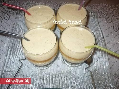 عند التقديم كنطحنو الفواكه،سكر ولحليب ونصبوه فوق الطبقة الاولى