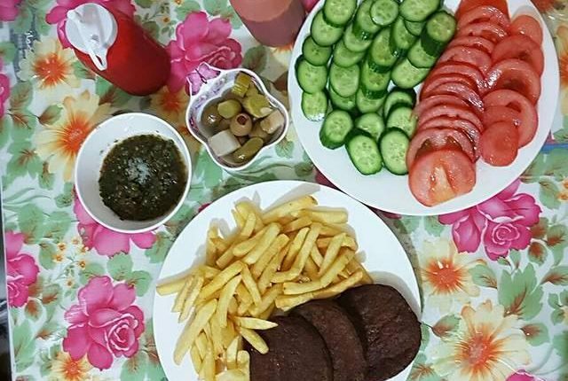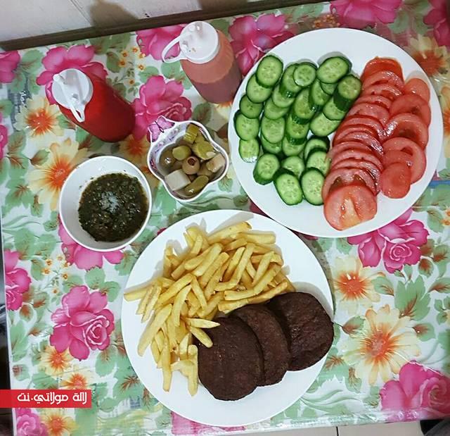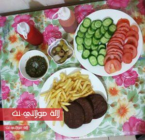 نحط رشة ملح كمان عالى الخيار و الطماطم و نقدم معهم السلطه الحارة و الشطة و الكاتشب… و المخلل…