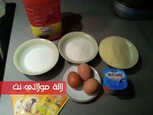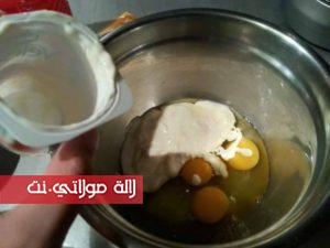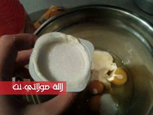 -نأخد إناء نعمل فيه البيض والياغورت والفاني ونأخد كأس الياغورت ونعبر به كأس سكر نضيفه إلى البيض والياغورت ونخلط الكل ثم نفس الكأس نعبر به كأس زيت ونضيفه إلى الخليط ونخلط من جديد و نعبر كأس كوك و-3 كيسان سميدة ونعمل كيس خميرة الحلوة ونخلط حتى تمتزج كل العناصر مع بعض نعمل الخليط في مول مدهون بالزبدة ونرشه بالسميد ندخلو الفرن 180° مدة 30 دقيقة