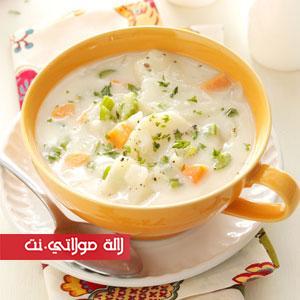 • يضاف مرق الدجاج وتترك القدر على النار حتى تغلي. تخفف النار وتترك القدر على نار هادئة مدة 20 دقيقة أو حتى تصبح البطاطا طرية.