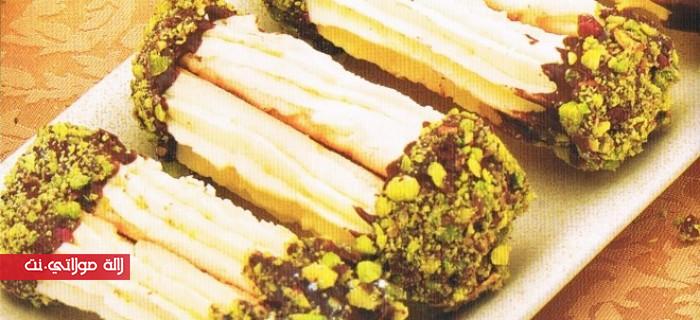 4_ اغطسي الحافتين في الشكلاطة الدائبة في حمام مائي ثم مرريها في الفستق المكسر.