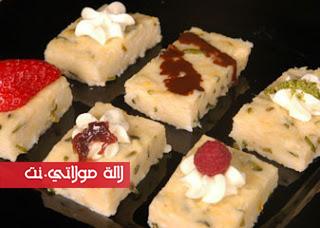 – يُخفق البيض جانباً ثم يُضاف على مزيج الحليب مع التقليب بسرعة. – تُفرد الحلوى في قالب مستطيل مدهون بقليل من الزيت. – تُترك الحلوى لتبرد وتتماسك (يمكن وضعها في الثلاجة) ثم تُقطع لمربعات متوسطة الحجم.