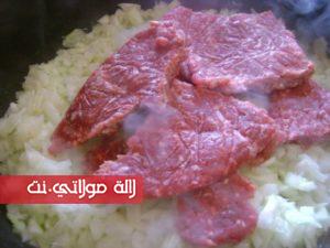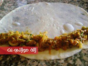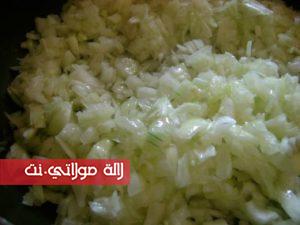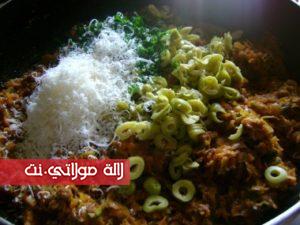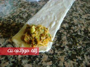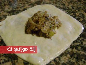 في مقلاة نضع البصل المقطع رقييق مع الزيت {زيت الزيتون او زيت نباتي } ونقلبه بعض الوقت ثم نضيف كمية من اللحم المفروم ونقلبه كذلك لبعض الوقت ثم نضيف الجزر المبشور وكدلك الكوسة مبشورة { قرع اخضر } ونضع التوابل من ملح وفلفل اسود وفلفل احمر حلو {تحميرة } والقليل من بودرة الثوم المجفف .. نترك الحشو حتى ينضج ويتجانس وبعيدا عن النار نضيف الزيتون الاخضر مقطع وبقدونس وجبن مبشور ونخلط الكل وهاهي الحشوة اصبحت جاهزة نتركها ونهيئ العجين