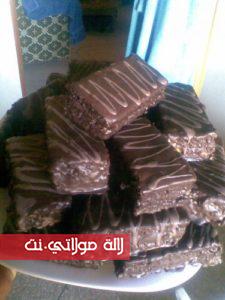 بعد اخراجها من الفرن تقلب فوق ورق زبدة اخر ونقطع الجوانب ونسقيها بالسيرو .