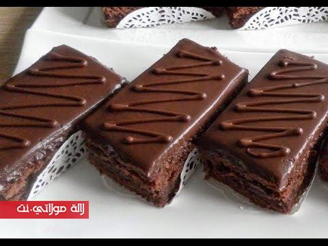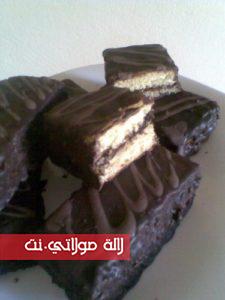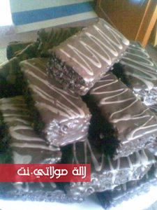 نذوب الشكلاط ونضيف اليه الياغورت طبيعي او قشدة حسب المتوفر وندهن به الكيك ونضع طبقة اخرى من كيك جينواز ثم نقطعها مستطيلات ونغمسها في شكلاط اخر مذوب ونزينها بخطوط من الشكلاط مخلط بين شكلاط اسود وابيض.