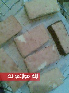 نطرب البيض مع السكر والفاني حتى يتضاعف الحجم ثم نضيف الدقيق المغربل مع الخميرة بالتدريج والخلط بواسطة ملعقة خشب من الاعلى الى الاسفل بحدر ونصب الخليط في صفيحة فرن مفروشة بورق الزبدة بشكل متساوي وندخلها الفران سخون وعلى درجة حرارة متوسطة لمدة 10د.