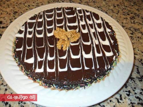 2بيضات+كاس قهوة معصرة+كاس سكر+كاس زيت+1خميرة+2معالق كاكاو+2كؤوس دقيق+قشرة حامضة محكوكة تنخلط كلشي مزيان وندخلها طيب من توجد نذهنها بالشكلاط مذوب ومعه دانون وندير خطوط بالكريم شانتيي ونزينها بالشكلاط فيرمسيل في الجوانب
