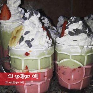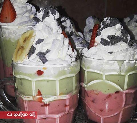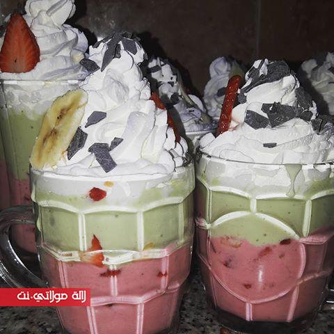 • نضع كريم شانتيي كطبقة اولى في الكاس ثم خليط من الفواكه المقطعة مربعات (افوكا،فريز،موز،اجاص،تفاح)ثم خليط الفريز تبعتو بخليط الفواكه ثم خليط البنان ومن بعدو الفواكه و في الاخير لافوكا ثم الفواكه الكركاع اللوز البيستاج ونزينو بكريم فريش