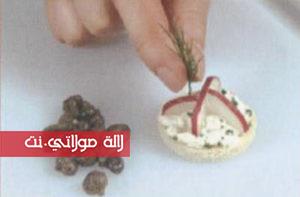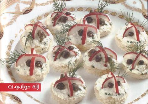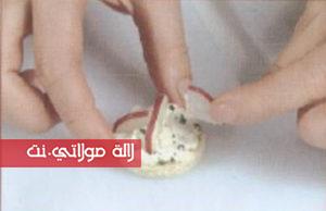 نقطع الخبز بواسطة طابع الحلوى على الشكل المرغوب فيه. نضع الجبن في إناء ثم نضيف إليه الثوم القصبي بعد تقطيعه بالمقص. يغسل الفجل جيدا و يقطع إلى دوائر ثم تقطع كل دائرة إلى نصفين.
