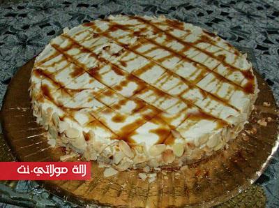 ثم نصبه فوق البيسكوي وندخلها المجمد حتى تبرد ,ثم نزينها بخطوط الكارميل ,ونزين الجوانب باللوز إيفيلي المحمر
