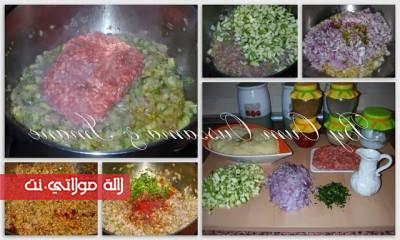 نعملو البصلة مع شوية الزيت على النار حتى تدبل ثم نضيف القرع والملح ونغطيهم باش تطيب القرعة ثم نضيف الكفتة ونفرتتها ونضيف التوابل والربيع ملي تطيب الكفتة وتنساجم العناصر نخلي الحشوة تبرد ونصفيها من الزيت