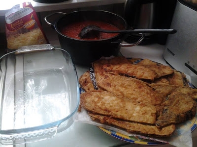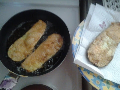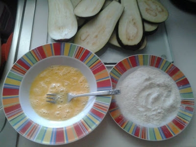ضر الباذنجان يقطع على طول كما هو واضح في الصوره يرش بالملح ثم يفند في الطحين و يغطس في البيض و يقلى في الزيت