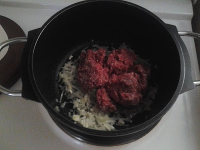 ناخذ طنجرة نضع فيها قليل من الزيت و بصلة محكوكة و الكفتة نشحرهم شوية