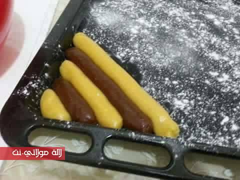 تقسم العجينة على 2 يضاف الى 1 الكاكو فالصينية نعمل كما في الصورة و كي طيب ندهنها بالمربى ونرشها بنوادكوكو و كي تبرد شويا قسميها