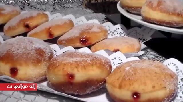 نأخذ حبات البيني ونضعهم في السكر على الجهتين ونقوم بوضع المربى في كيس حلواني ونثقب ثقب صغير وندخل المربى في البيني وكذلك مع البيني المحضر في الفرن.