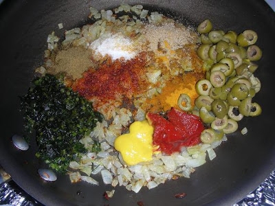 في مقلاة على النار نشحر البصل في القليل من الزيت نضيف التوابل الزيتون الربيع الهريسة و الموطارد