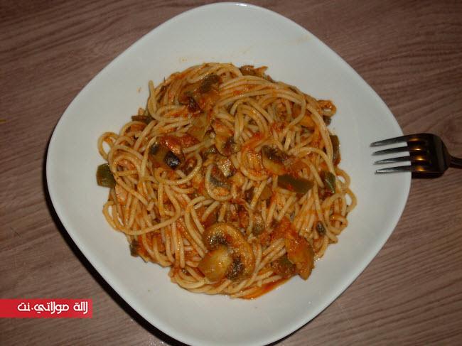 - تسلق سباكيتي في ماء مملح و تصفي و تترك حتى تنشف تماما من مائها ثم تخلط بالصلصة و تقدم