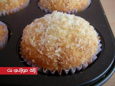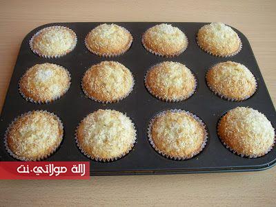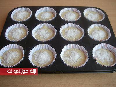 ونخلط ،ثم نحضر مول المادلين ونضع فيه الكؤوس الورقية الخاصة بالمادلين ،ثم نصب كمية من العجينة فى الكؤوس،وعلى الوجه نرش الجوز الهند الباقى،ثم ندخل المادلين للفرن الساخن.