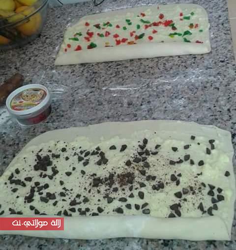 عندما تخمر العجين نورقها على شكل مربع ,ثم نعمرها  بكريم باتيسيير , ثم تعملي شكلاط مقطع أو فواكه ملونة ، لكي الإختيار .