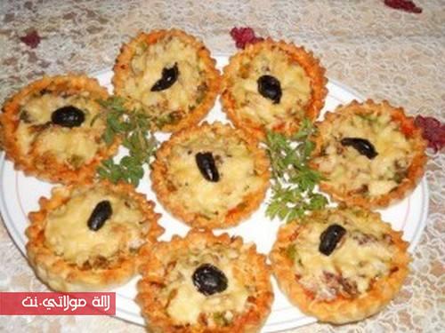 2زلايف دقيق ابيض +اصفر بيضة كاس مخلط زيت رومية وبلدية شوية زغتر شوية كمون شوية تحمرة لاعطاء اللون كاس ماءالدافئ شوية ملح خمارة حمراء طريقة التحضير : 1- نخلط الماءر والملح وزيت الزيتون وزيت المائدة والخميرة الحمراء في وعاء متوسط إلى ان تتفاعل الخميرة . 2- ونخلط جميع المكونات الجافة مع بعض وتعجن جيدا لى ان تتكون لدينا عجينه طريه ولكن لاتلصق باليد . 3- نغطيهاقليلا ونضعهاتخمر 10دقائق . و الان اصبحت العجينة جاهزة و يمكنك استخدامها مع اى من المكونات التى تفضلينها صوص الطماطم(طماطم-زيت-ملح-بهار-قليل من الزعتر الطون الزيتون الأسود فرماج محكوك أولا نضع العجين بهذا الشكل تطلق العجينة و تقطع بالكأس مثلا ثم ترشم بمقطع دائري قطره أقل من قطر الكأس ثقب يالفورشيط ثم تطهي نصف طياب تم نضع صوص الطماطم ثم الفورماج ثم الزيتون يضاف يعض الاعشاب المنسمة وتدخل الفرن لتستوي وتقدم بالصحة و العافية.