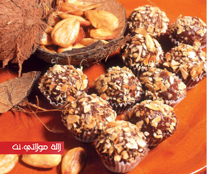 5 – تغطسي كويرات الكوك في الشوكولا وتضعيها مباشرة في القوالب وتزينيها باللوز المقلي و المهرمش.