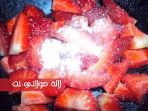 ناخدو 6 حبات فريز على النار مع 2 معالق سكر حتى يتعسل شوية تم نصفيوه