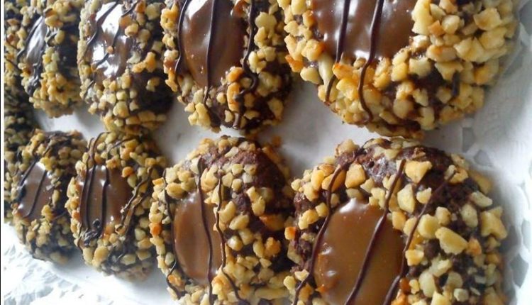 نضيف إلى الزبدة الجبن والسكر نمزج برؤوس الأصابع حتى نحصل على خليط أملس، نضيف إليه أصفر البيض والكاكاو والفاني نمزج العناصر جيداً ثم نضيف الدقيق والخميرة الكيماوية نجمع العجين، نلفة في البلاستيك الغذائي نتركه جانباً لمدة ساعة تقريباً. بعدها نأخذ العجين نشكل منه كرات صغيرة نمررها في أبيض البيض ثم اللوز مهرمش، نضع ثقب وسط كل كرة. ندخل الحلوى لفرن معتدل الحرارة على نار قليلة لمدة 20 دقيقة تقريباً.