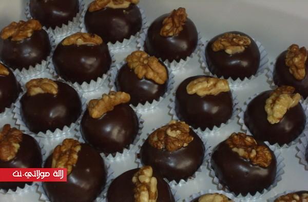 نخلط جيدا اللوز و الجوز و الكاجو و الكراميل و نصنع منها كويرات تم نمررها بالشكلاطة المدابة و نزينها بحبات الجوز و نتركها تبرد تم نضعها في كاسات ورقية حسب حجمها و نقدمها بالصحة و الراحة.