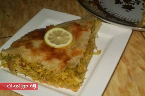 ناخد ورق البسطيلة ونصففه في صينية دائرية مذهونة بالزبدة والزيت ونضع الحشوة في الوسط ونطوي الجوانب كما هو موضح في الصورة ونذهنها بالزبدة وندخلها الى الفرن إلى أن تتحمر