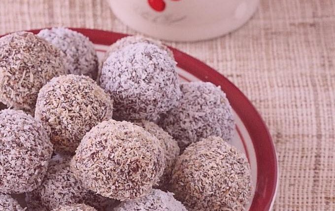 نغمس الحبات في الشكولاطة الذائبة،و نضعها فوق الرف،ثم نمررها في جوز الهند حتى تتغطى.