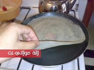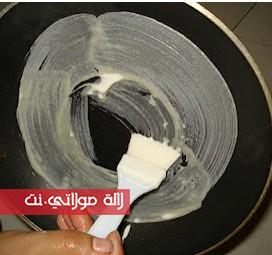نحتاج إلى مقلاة من نوع “تيفال” (التي لا تسمح بلصق العجين ) نقوم بوضعها على النار قليلا ثم نقوم بوضع العجين على المقلاة بواسطة فرشاة كما هو موضح في الصورة التالية