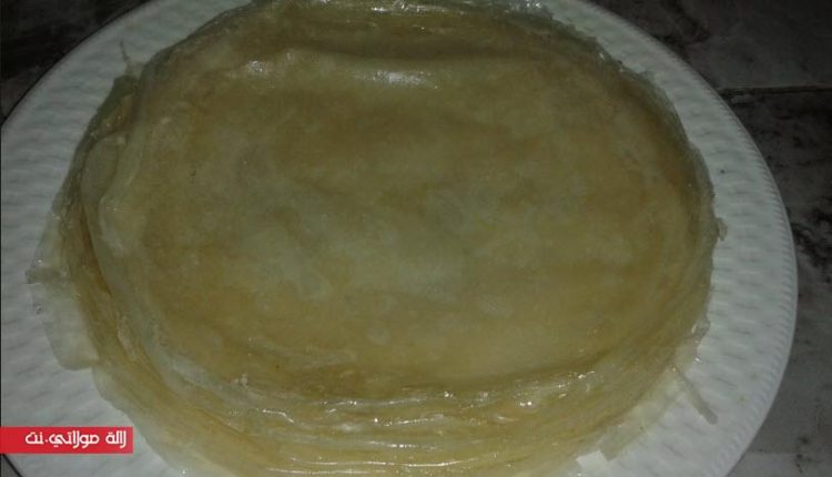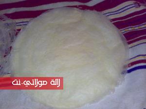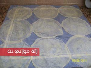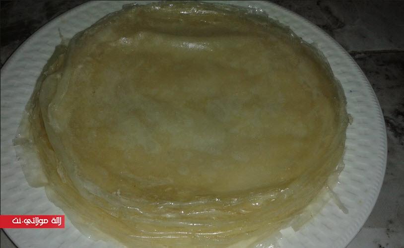 بعد ذلك نضعها على النار مدة 3 دقائق تقريبا يجب أن تبقى طرية .فحينما ترتفع جوانب الورقة عن المقلاقة فييجب ان نزيل الورقة من المقلاة وبعدها نقوم بدهنها بزيت المائدة حتى لا تجف.