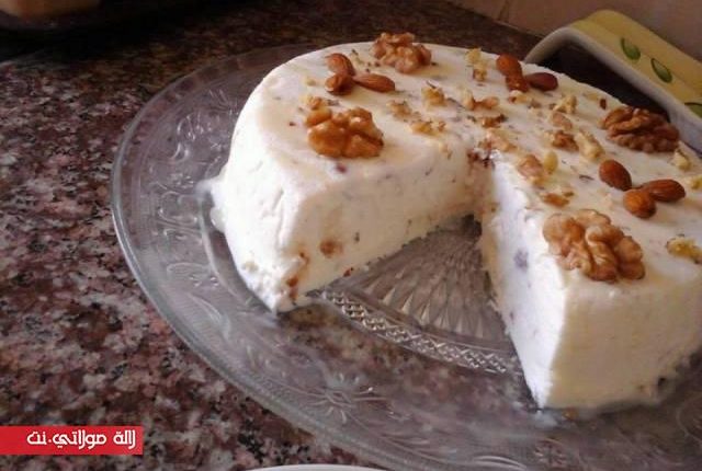 نضرب الحليب و بوردة الشانتيي حتى تطلع و نضيف الحليب المركز و الجوز و اللوز و ندخله المجمد 7 ساعات.