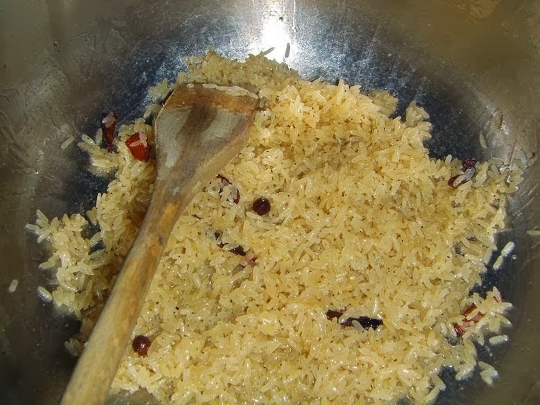 سخني الزيت وسخني فيه العطرية وغير تطلع ريحتها ضيفي عليها الروز وشحريها 2 دقايق تقريبا وضيفي ضعف قياس الروز من الماء