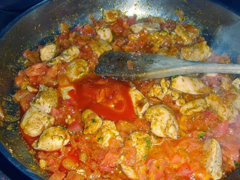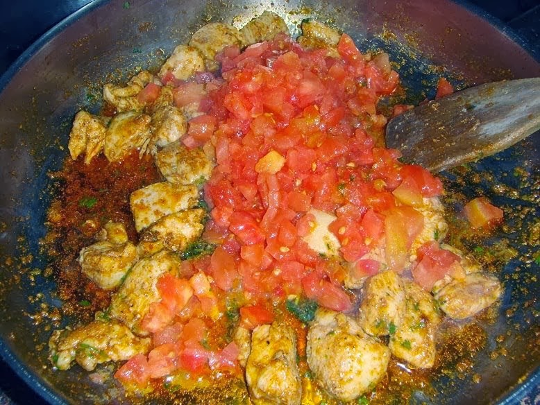 خلطي الدجاج مع كل التوابل والزيت وشحريهم مزيان وضيفي الطماطم والقزبور والصلصة وخلي الكل يطيب