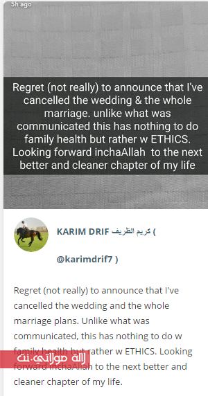 وأنهى ظريف تدوينته بالإشارة إلى التطلع للأفضل والنظيف في حياته بعد إلغاء عرسه، وهو ما جعل العشرات من المتفاعلين معه يعبرون عن دهشتهم وصدمتهم بسبب هذا الإلغاء.