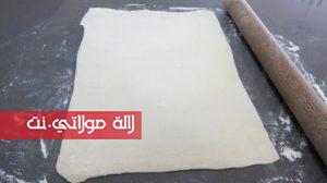 نرش الدقيق لكي لا تلتصق العجينة ثم نفردها كما هو مبين في الصورة