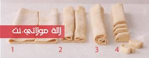 نرش العجينة بالسكر كاملة ثم نلفها كما هو مبين في الصورة الثانية و مع كل لفة نرش السكر