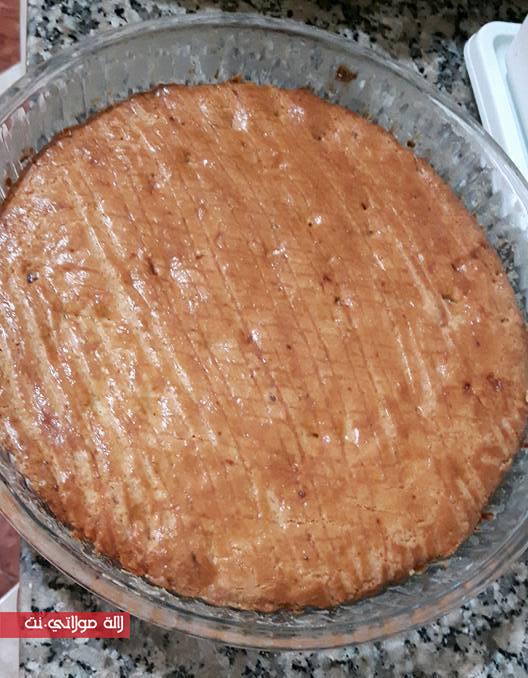 نخلط السكر والبيض والزبدة ونضيف الباقي المقادير حتا نحصل على خليط مثل الكاليط لازم تكون مكتلصقش في اليدين تبسط في الصينية المدهونة وتشرط بالسكين وتدهن بالبيض المخفوق وتدخل للفرن