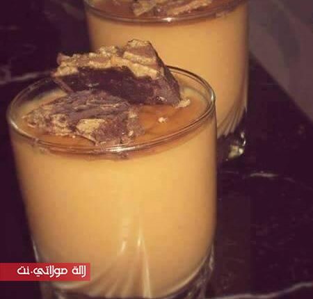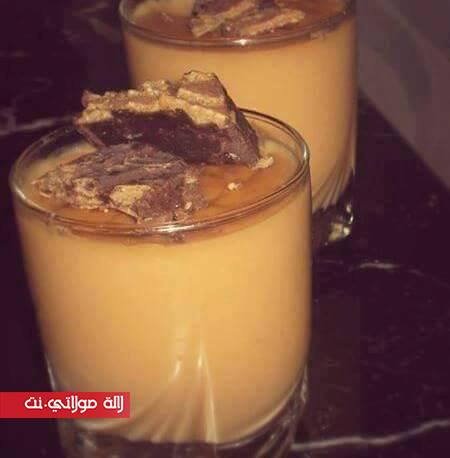 منين كيوليلنا داك السكر كراميل منخليوهش اتحرق كنضيفوليه الحليب اللي فيضنا ادوبنا فيه الشكلاط انضيفوليه البيضة اللي طحنا مع النشا انحركو كلشي فوق عافية مهيلة حتى يعقاد الخليط انحطوه فكؤوس اندخلوه ابرد فالتلاجة.