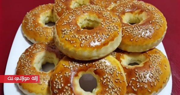 بعد ذلك نبسكها و نقطها على شكل كعك نتركها تختمر جيدا و تدهن باصفر البيض المضاف اليه قطرة من الخل و نزين بالسمسم و تطهى في الفرن