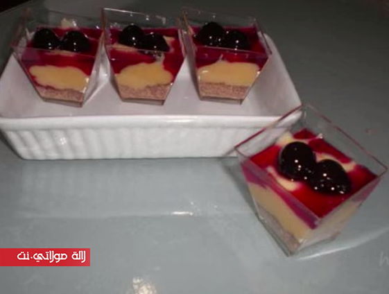 ناخدو أي بسكوي نطحنوه ونخلطوه مع الشكلاط محكوك ونضعه في كؤوس التقديم ونضع فوقه الكريم ثم أي نوع من الفواكه معسلة مع عصيرها