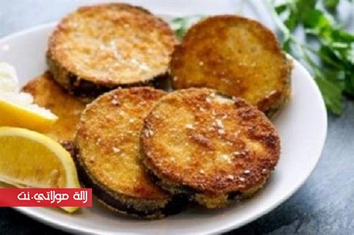 – قطّعي الباذنجان شرائح واضربي البيضة مع الملح، الفلفل وتبّلي خبز محمص مطحون أيضاً بالملح والفلفل.