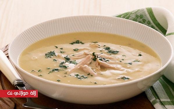 عند التقديم، يسخن الحساء ويضاف إليه شرائح الدجاج.