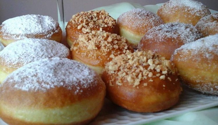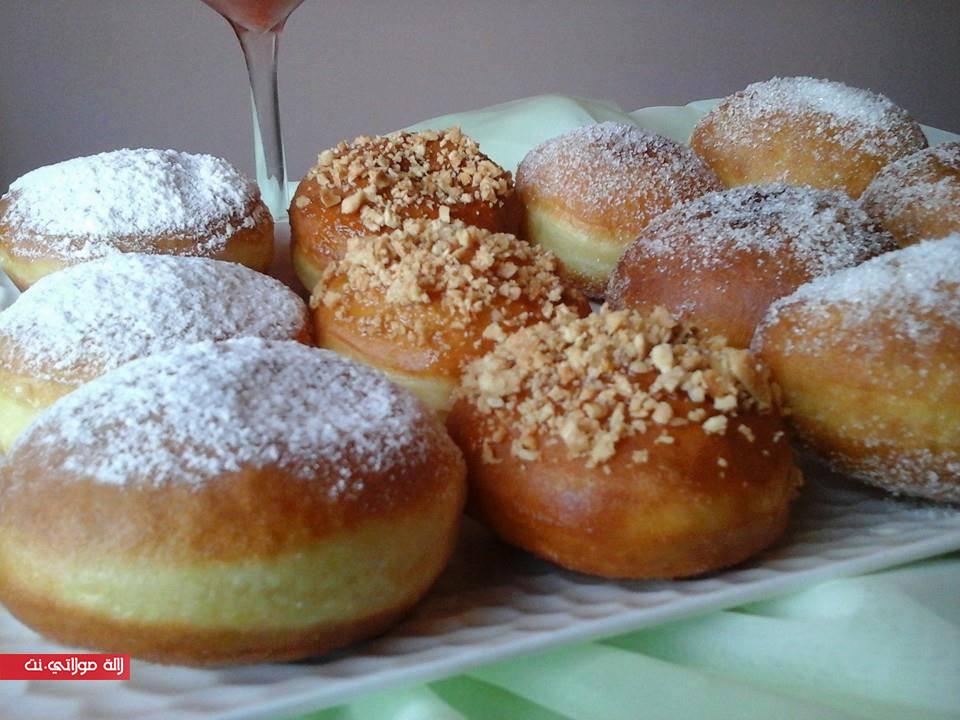 تعجن وتترك لترتاح نصف ساعة ثم تبسط وتقطع دوائر ثم تغطى وتترك لتخلمر تقريبا ساعة ثم تقلى في الزيت تحشى بالكريم باتسيير او المربى وتزين حسب الرغبة .