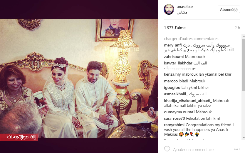 ونشر الفنان الباز صورا من منزل العروس في مدينة مكناس، رفقة زوجته ووالدته، وكانا مرتديان الزي المغربي التقليدي، الخاص بالزفاف، خلال توقيعها على عقد قرانهما، وحصدت الصورة في وقت وجيز على أزيد من ألفين علامة إعجاب.