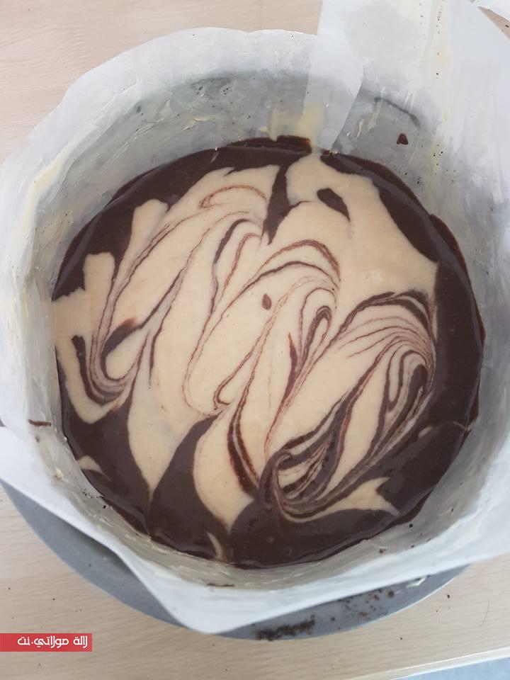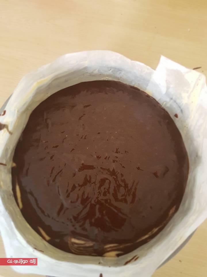 ناخد مول الكيك و ندهنه بالزبدة و الدقيق و نصب فيه نصف الخليط
