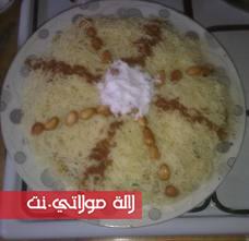 قطعى اللحم او الدجاج ثم شلضى عليه البصلة والمعدنوس +الملح+الابزار+السمن+القرفة عواد+الزعفران+سكينجبيروالزيت شحرى الكل فوق النار زيدى عليهم كاس ونصف من الماء وخليه يطيب حتى يشرب الماء وطفى عليه ,سخنى الشعرية فى الكسكاس ودهنيها بالزبدة وجيبي طبق التقديم فرشى فيه التفريشة الاولى بعد دلك ضعى الدجاج غطى بالشعرية ثم الدجاج واخيرا غطى بالشعرية وزوقى باللوز والقرفة غبرة كما في الصورة